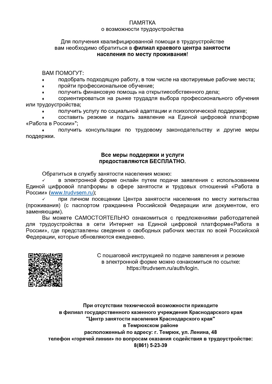 Филиал ГКУ КК «Центр занятости населения Краснодарского края в Темрюкском районе информирует граждан, в том числе прошедших курс лечения и реабилитации от наркомании и (или) алкоголизма, освободившихся из учреждений, исполняющих наказание в виде лишения свободы о возможности трудоустройства.