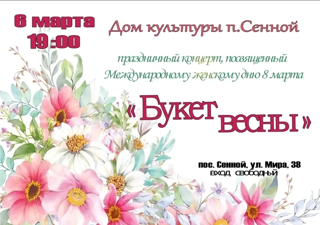6 марта в 19:00 в Доме культуры п. Сенной (ул. Мира, 38) состоится праздничный концерт, посвященный Международному женскому дню!